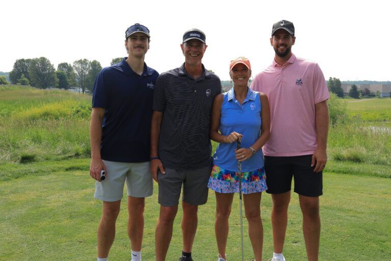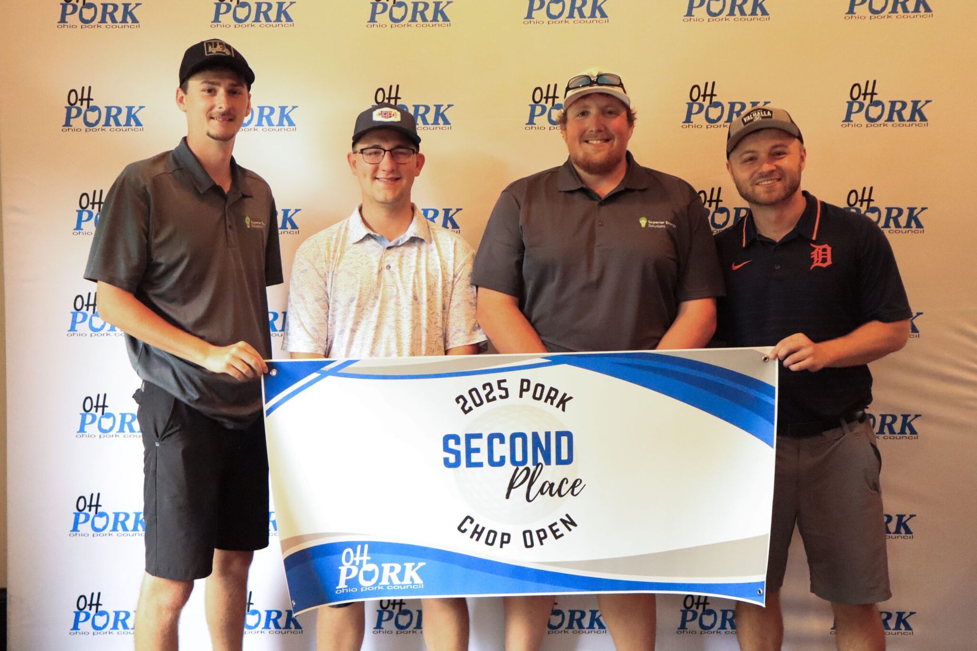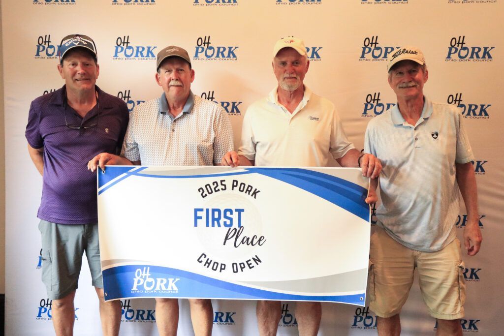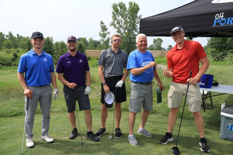Ohio Pork Council President Nathan Schroeder (far left) presents the Ohio Pork Industry Excellence Award to Jim Albaugh who is joined by his family members (left to right), Dixie Albaugh, Dakota Albaugh, Sheri Albaugh, and Dennis Albaugh.